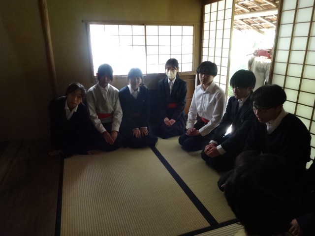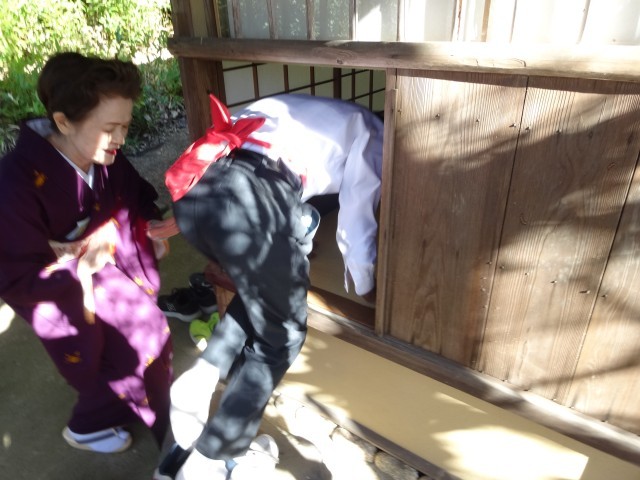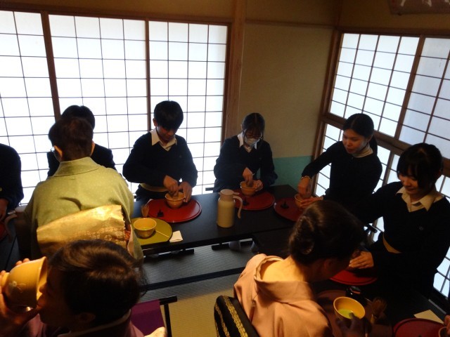 生徒の皆さんは、茶道の作法について体験したり、実際にお茶をたてて飲んでみたり、小間と呼ばれる小さい茶室に、にじり口から入ってみたりなど日常生活では味わえない体験をしました。