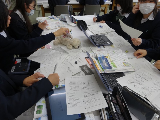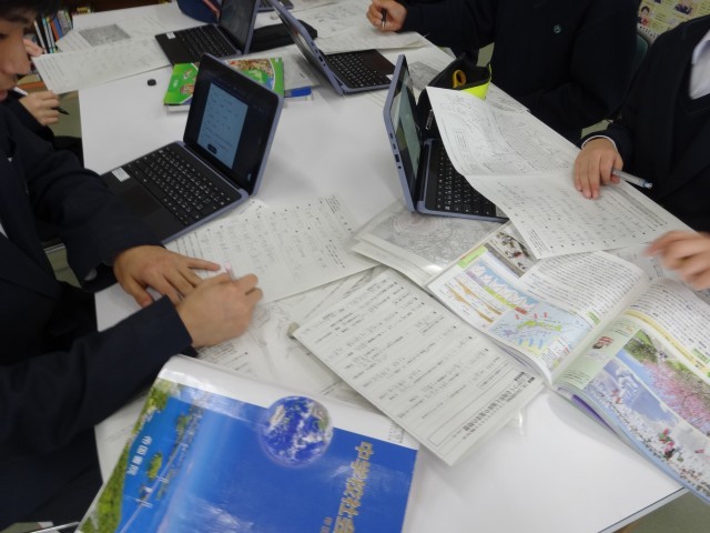 1年生の社会の様子です。図書室で調べ物をしながらプリントに取り組んでいます。