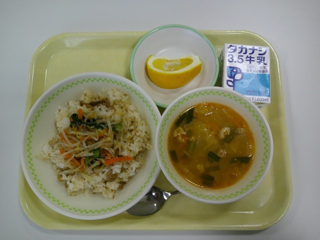 〜本日の献立〜 ビビンバ ビビンバのナムル(ごはんの上にのせます) トック入り町田産キムチスープ 美生柑(みしょうかん) 牛乳
