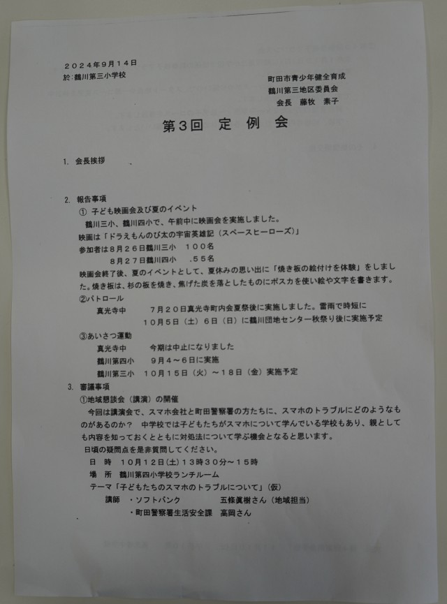 鶴川第三小学校で「鶴川第三地区委員会」が開催されました。