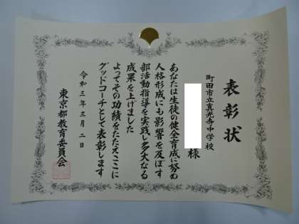 サッカー部の顧問の先生が「グッドコーチ」として、東京都教育委員会から表彰されました。