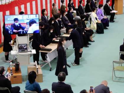 卒業証書を受け取る卒業生のお顔をビデオで撮影して、保護者席に写し、お家の方に成長した姿を見ていただきました。