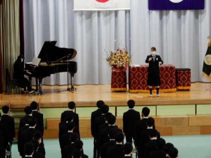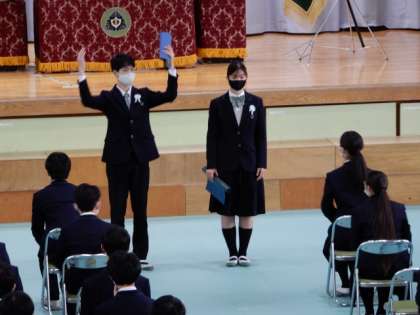 写真上:校歌を歌うときの指揮者と伴奏者。1年間のコンビです。今日で解散です。