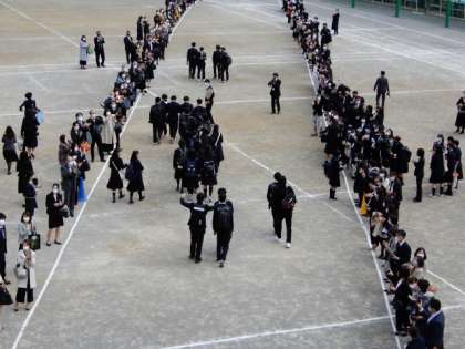 写真中:校庭の見送り(保護者と有志の生徒たち)
