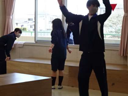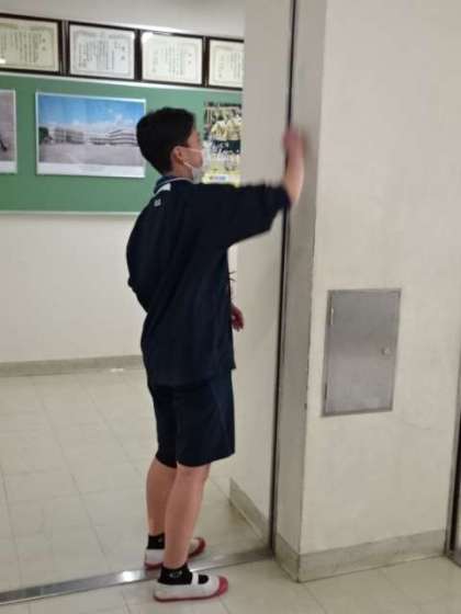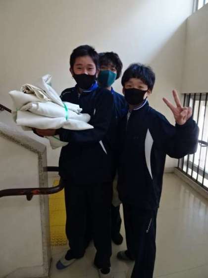 写真中:教室のカーテンを外して、視聴覚室に運んでいるところをパチリ