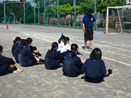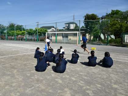バトンパス、今まではバトンを渡す人が「はい」と声をかけて次の人は走り出しましたが、どこまで来たら走り出すかのタイミングを知って、バトンパスをする練習をしました。