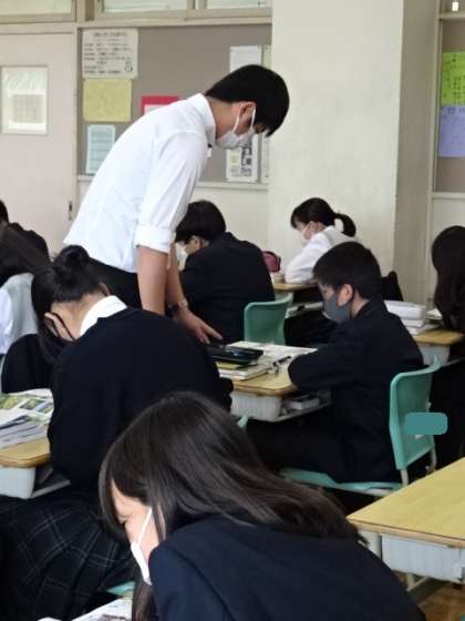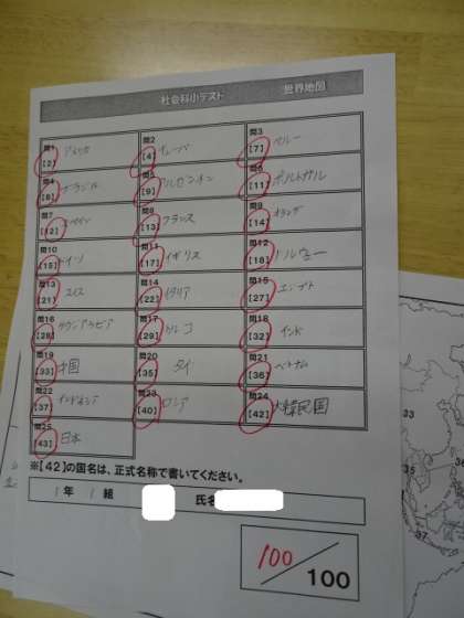 最初に前時に実施した小テスト(世界地図を見て国名を答える)が返却されました。教室中が「歓喜と次は頑張ろう」という気持ちにあふれていました。
