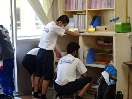 ベランダの樋の周りにある、落ち葉を取り除いています。