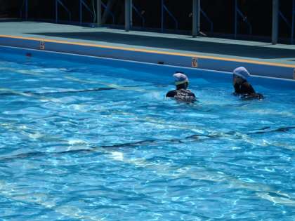 陸上部は、気温があまり上がらない朝のうちに練習をして(WBGTが31を超えると運動は中止です)、クールダウンを兼ねてプールに入りました。ただ、密にならないため日替わり男女別です。(今日は女子でした)