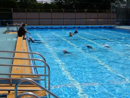 陸上部は、気温があまり上がらない朝のうちに練習をして(WBGTが31を超えると運動は中止です)、クールダウンを兼ねてプールに入りました。ただ、密にならないため日替わり男女別です。(今日は女子でした)