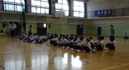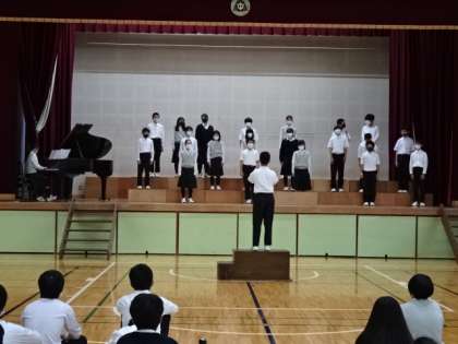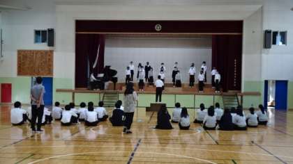 体育館では、1年1組の歌声を3年1組の先輩に聞いてもらいました。