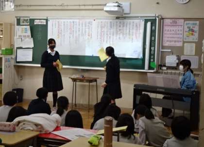 歌詞を黒板に貼って、言葉の意味を理解し、強弱等の歌い方を細かくチェックしていました。