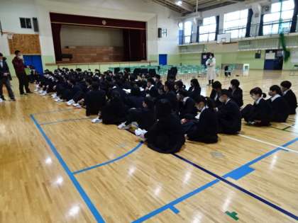 最後に生活指導主任の先生から「東京都の中学校の代表として意識した生活をしよう」とお話があり、最後に班ごとでの集合体型の練習をしました。