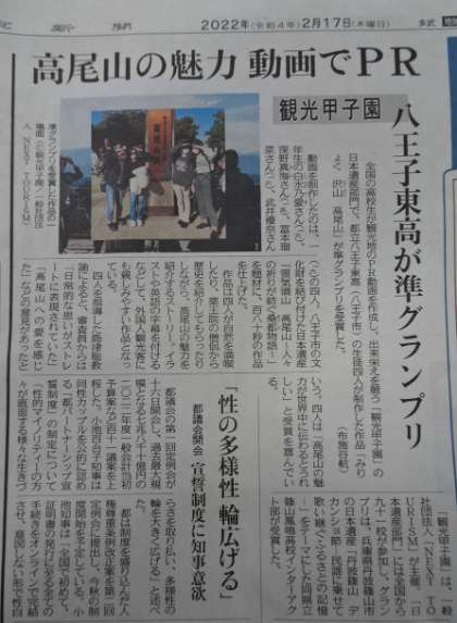 今朝(2月17日)の東京新聞、多摩武蔵版に「観光甲子園」の記事が載っていました。