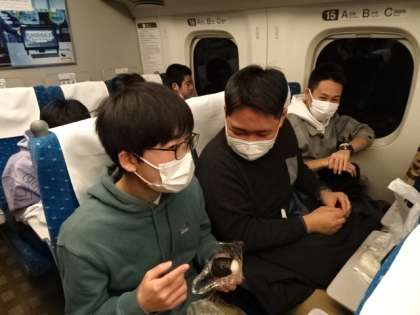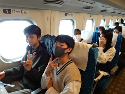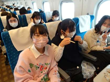 これまでの修学旅行の新幹線の中は、席を向かえ合わせにして、UNOやトランプをしたり、おしゃべりをしたり賑やかな車中なのですが、感染防止対策のため、席の移動は禁止。おしゃべりも極力最小減にということで、静かな車中です。