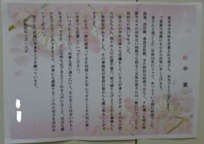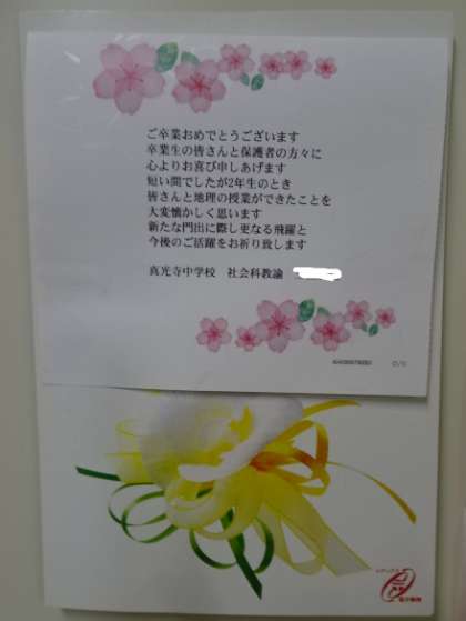 写真下:社会の先生から(産休中)