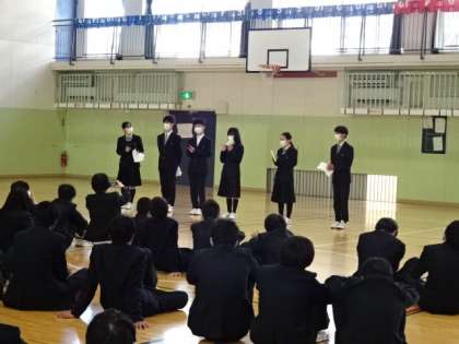 1年生は体育館で、2年生は音楽室で学年代表から3学期の反省と学年の先生から一言ずつお話がありました。2年生はサプライズで、1年間の思い出の映像を観ました。