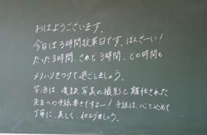 朝、校内を回っていたら、担任の先生から素敵なメッセージが黒板に書かれていました。