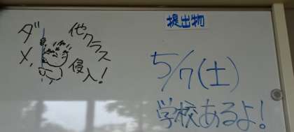 校内を巡っていたら、3年生の連絡ボードに、「5/7(土)学校あるよ」とありました。