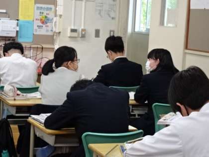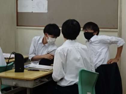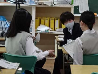 ワークシートに問について、小グループで話し合い活動をしていました。
