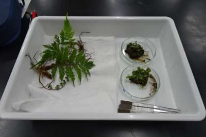 イヌワラビ ゼニゴケ(雌株と雄株) をルーペを使って調べます。