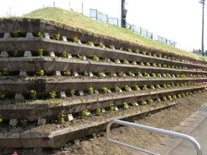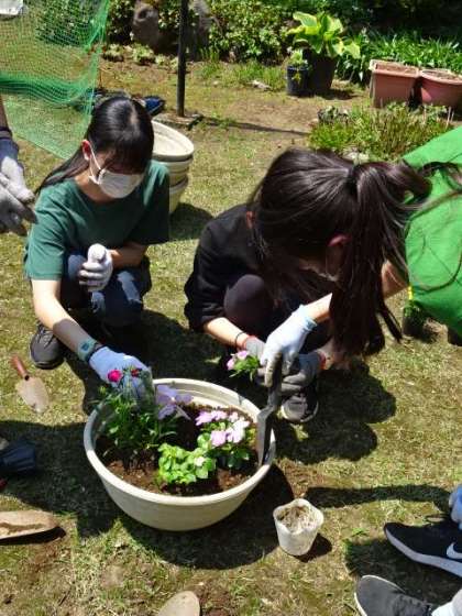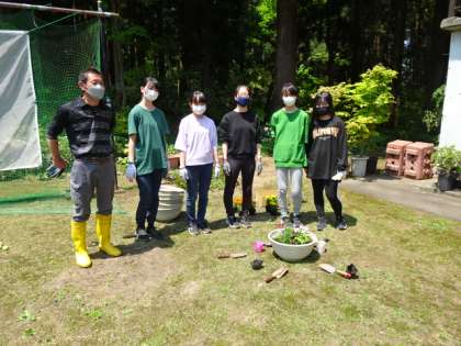 実は、朝一番で、市の総合運動場の花壇に花を植えに行ったのですが、その時は地域の方と一緒だったので、植え方をきちんと説明できないまま仕事行ったので、植え方の説明をしながら、再度植えているところでした。