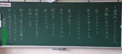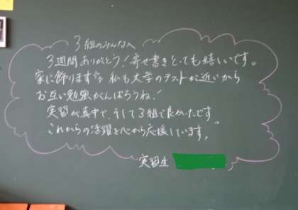 朝、校内を回っていたら、教育実習生が、担当したクラスの黒板にメッセージがありました。