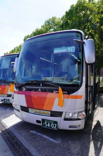 写真下:奈良に向かうための貸し切れバス(TEISAN)
