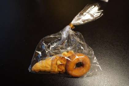 お昼ごはんが早かったので、ボリュームあるパンと(クロワッサン、ドーナツ、ワッフル)お水です。
