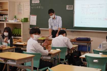 写真上:2年3組 数学「方程式のグラフの書き方を理解する」
