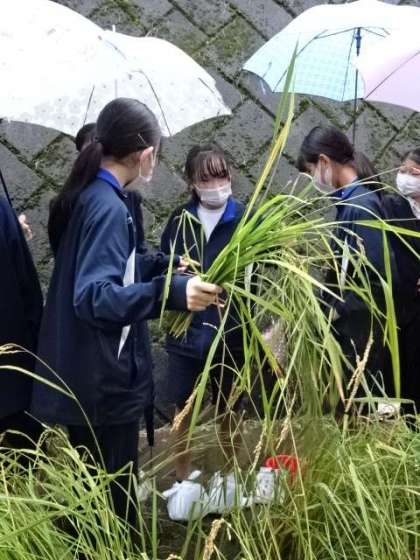 刈り取った稲は、みんなで協力して、藁で束ねます。