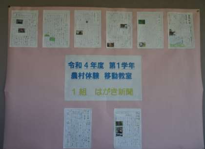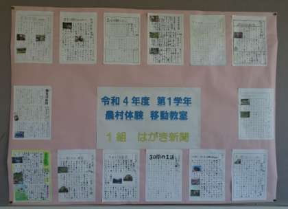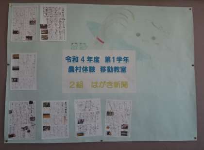 1年生の廊下に「農村体験移動教室のはがき新聞」が掲示されています。