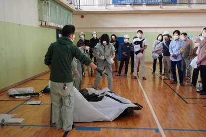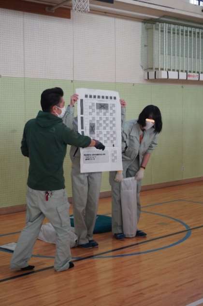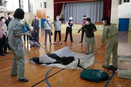 避難場所は体育館になりますが、個人のスペースの確保と感染防止のためのテントについて説明がありました。