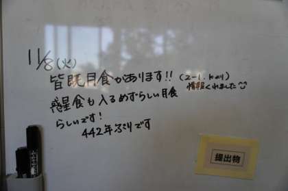 3階2年生フロアのホワイトボードに「皆既月食」情報がありました。