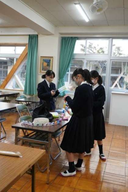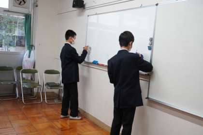 7時45分、1年2組の有志と助っ人の人達が多目的室で何やらやっています。