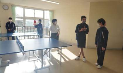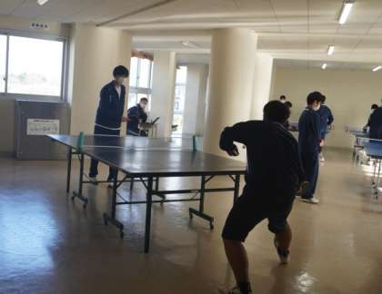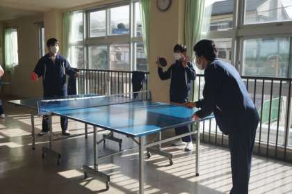 計画では校庭での長距離でしたが、昨日の雨の影響で校庭がぬかるんでいるため、多目的ホールで、卓球です。