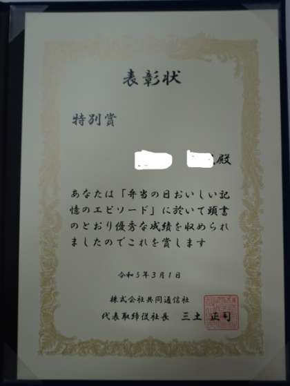 写真中:「弁当の日おいしい記憶のエピソード」 特別賞
