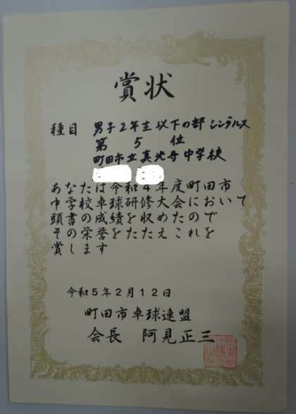 写真下:卓球 男子2年生以下の部(シングルス) 第5位