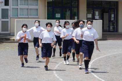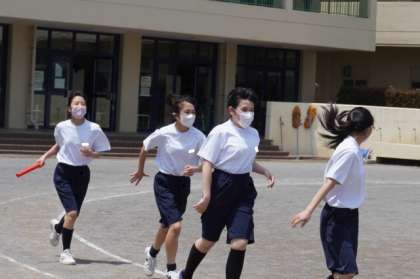 4人でバトンパスをしながら、校庭を1周シました。