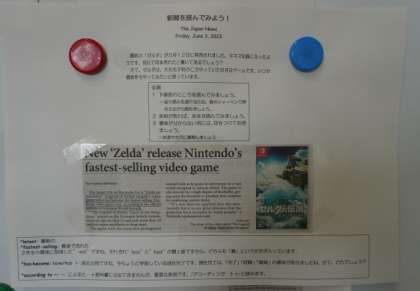 2階3年生フロアのホワイトボードの英字新聞が新しくなりました。