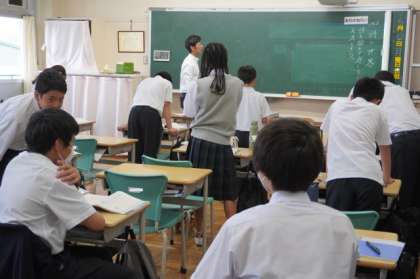 写真の1枚目は、起立して詩を音読し、読み終わった人から席についているところです。