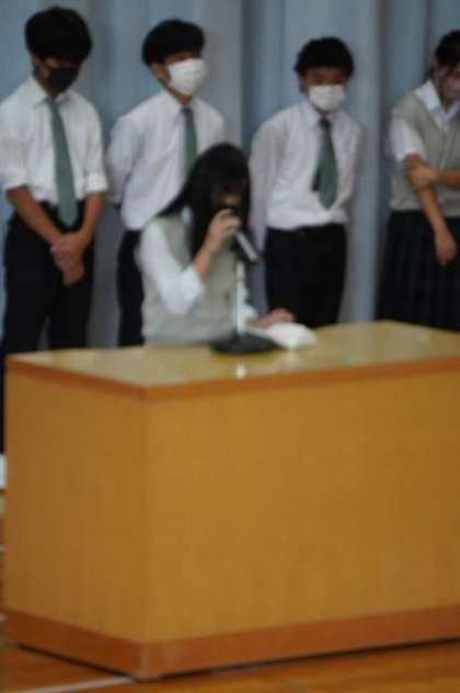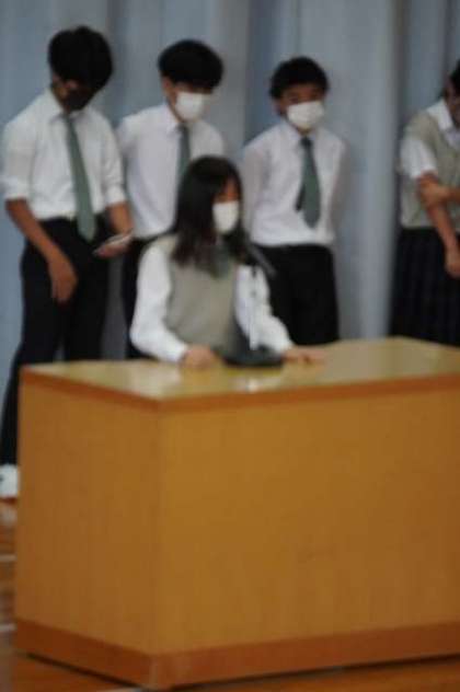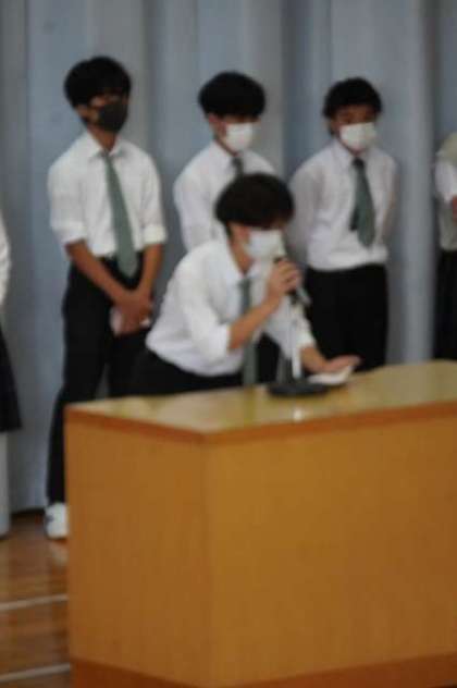 写真中:保健委員会「7・8月の目標を決めました。テスト勉強で夜遅くまで起きていると体調が悪くなります。気をつけましょう。リラックスとストレッチが大切です」