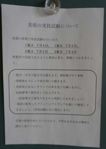 2年生の美術の実技試験のお知らせです。 計画的に準備を進めてください。