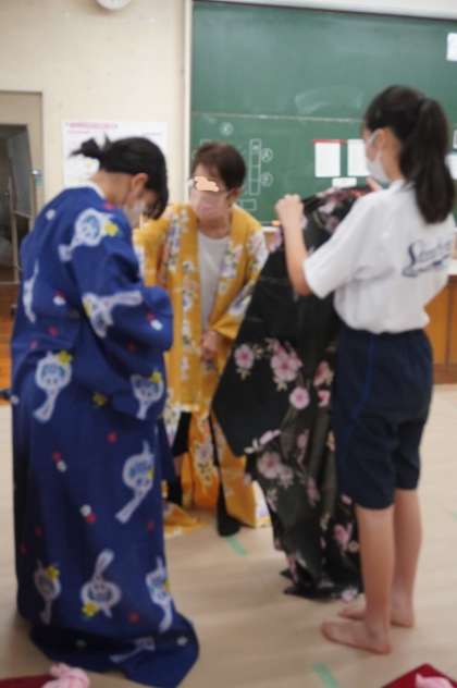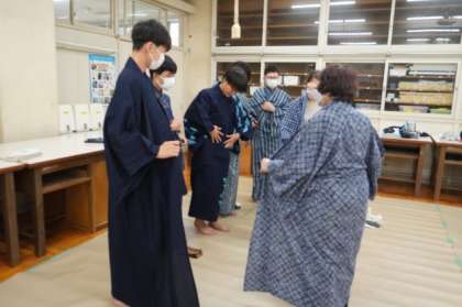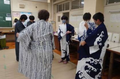 多くの学校は、教科書だけで「ゆかたの着方」を学習していますが、真光寺中学校は、実際に「ゆかたの着方」を体験することができます。