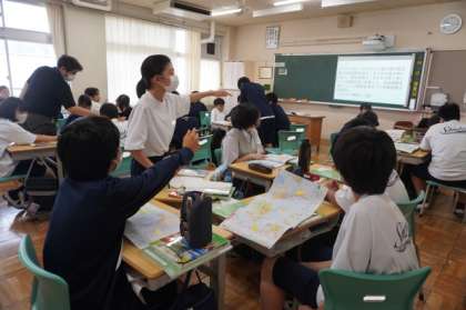 写真下:2年1組「社会」:中国・四国地方の産業を読みぬく
