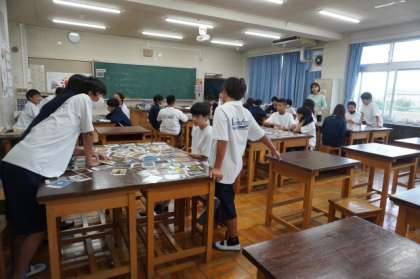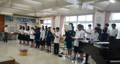写真上:1年2組「音楽」:課題曲『大切なもの』全員で最後まで歌おう
