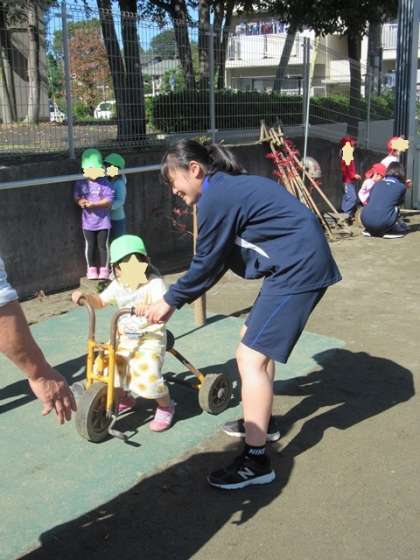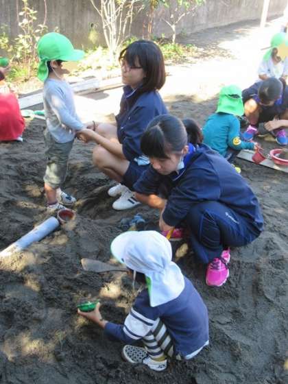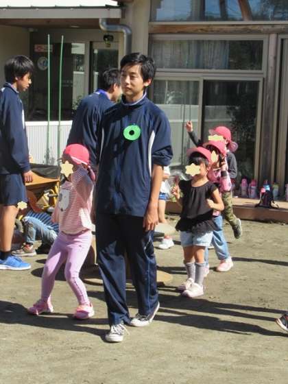 写真下:「だるまさんが転んだ」を大勢でやっているところです。このお兄さんは最初から鬼ごっこやかくれんぼをして、幼児から絶大な人気でした。