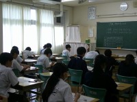 写真下:1年生国語「新聞記事からSNSの活用方法を考えよう」→SNS活用の利便性と注意点について考え、発表しあう(班ごとに発表形式を考えて、いました。この班はロールプレーを取り入れての発表をしました。)