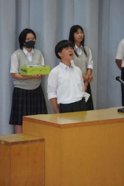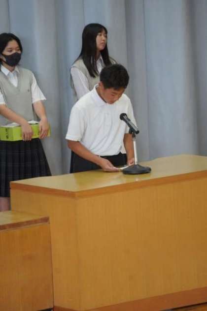 写真下:図書委員会・委員長が大きな声であいさつをしてくれました。