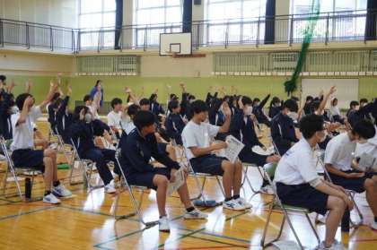 親指をつけて、かかとをつけてかかとを上げないで、しゃがめなかった人は手を上げてください。